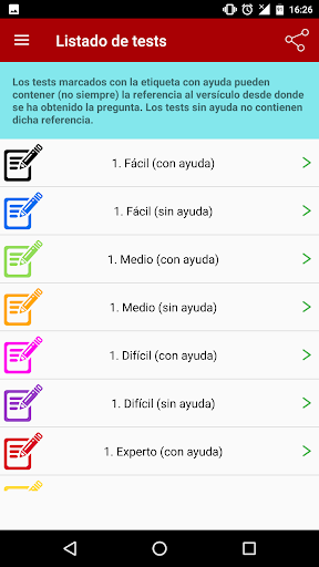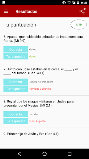 La aplicación guarda los tests completados y te indica cuántas preguntas has acertado. Podrás realizar y repetir estos tests tantas veces como desees para así afianzar tu conocimiento en este juego bíblico.