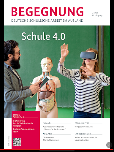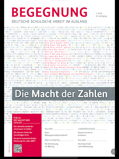 منذ أكثر من 35 عاما، كانت اللقاء مجلة التعليم الأجنبي الألماني ، في تطورات العمل المدرسي ليس فقط مضيئة في الخارج، ولكن أيضا في ألمانيا.توضح الموضوعات التعليمية لإدراجه على نقص المعلم إلى الموحدة المركزية بوضوح ومناقشتها مع إشراك الخبراء المعروفين.يظهر اللقاء في ربع ربع مع تداول 15500 نسخة.بالإضافة إلى ذلك، يتم توزيع 20،000 نسخة من أكبر المعرض التعليمي الأوروبي Didacta.تهدف المجلة إلى صانعي القرار من السياسة والثقافة والأعمال وممثلي ألمانيا في الخارج وكذلك المعلمين في الداخل والخارج.