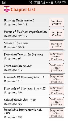 In this FREE version you would get 3 tests free in "Take a Test" and few free questions for 3 Chapters for each subject in "Practice Qs". The premium App costs Rs.590. In Premium App you will receive unlimited "Take a Test" as well practice through complete question bank using "Practice Qs"
