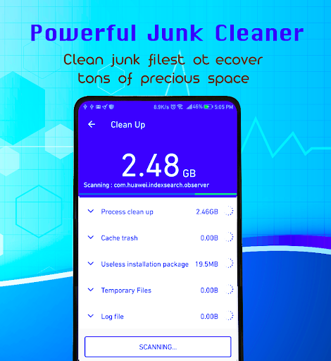 Based on our powerful Junk-Scan Engine, Power Clean can smartly detect useless files (system cache/app cache/uninstalled app residue/...), clean them up and release more storage safely.