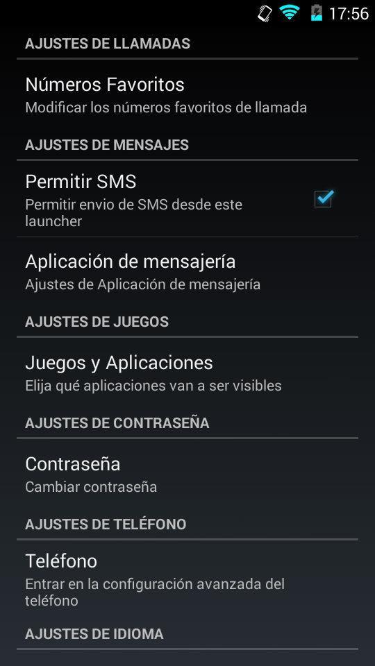 This menu can only be accessed to via password using the lock icon on the main menu. There, you can set up all the features of the Launcher such as the language, the personalisation options or even the phone settings using the native app of your OS.