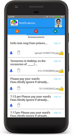 Schools are able to send messages to parents regarding Daily Homework, School Announcements or even specific message. Parents can set reminder against each notification they receive. School is also able to send attachments like document, excel, image, PDF etc. along with messages.