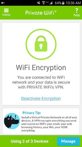Private WiFi is a cloud-based VPN service that protects your privacy and data security by encrypting all Internet communication when on unsecure public wifi.