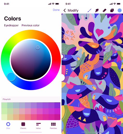 - Full procreate covering palette with contact camouflaging picker and subjects.