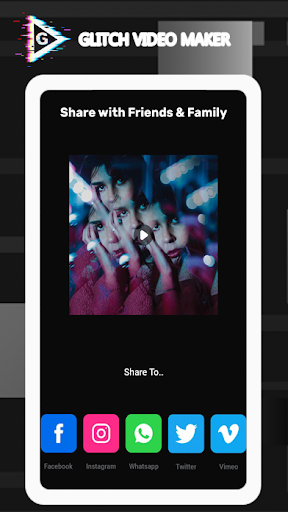 & Photo Editor can export your glitch art image or video to the gallery or share it with other apps like Instagram, WhatsApp, Facebook, Twitter, TikTok, Youtube, Flipagram, Snapchat, Funimate, Giphy or Musical.ly etc