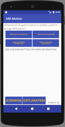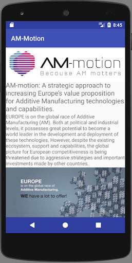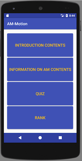 This App is aimed to disseminate AM knowledge as part of AM-motion project funded by European Union H2020 Programme under grant agreement nº 723560. It allows players to overview AM concepts relative to the different types of technologies and machines, the main advantages and drawbacks compared with other manufacturing techniques. The design of the parts according to AM requirements, the manufacturing process, how parts grow in height (layers), post-processing and main applications over different sectors is also covered.