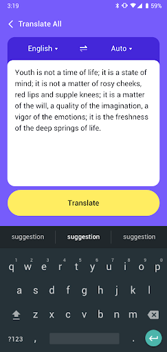 Translate words and sentences. Translate text. Easily copy and paste text. Share the translated text with your friends. Detailed history. Simple and attractive user interface. Excellent text translation application. Copy and delete text with one click.