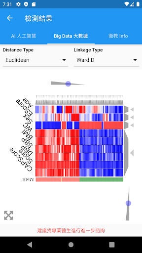 (3) 統計的多變量分析將使用者的生理狀態與去識別化大數據的電子病歷數據進行比對,視覺化分析去呈現使用者的健康狀況的是否有異常。