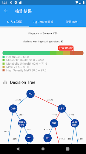 透過人工智慧中的機器學習技術,由大數據的資料庫訓練出不同慢性疾病和代謝症候群的預測模型與視覺化分析模組,提供預防醫學與健康評估一個穩健的醫療協助工具。