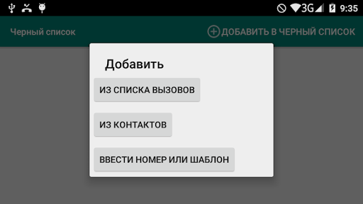 Позволяет вносить в черный список из контактов или набирать номер телефона или указывать шаблон номеров.