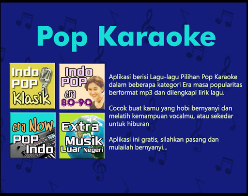 カラオケ、特にインドネシアのポップソングを好む人のために、このアプリケーションはあなたに最適です。このアプリケーションでは、古典的な曲、80-90anの時代の歌から、そして歌が広く知られていることが知られているまで、歌うことが知られているまで、歌うことが趣味や娯楽のためのものです。