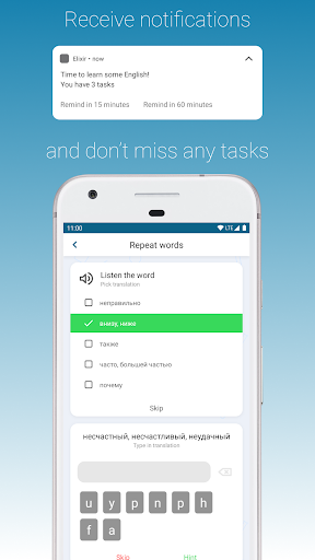 Learn English language with Elixir - you will naturally learn words thanks to clever algorithms that select words and scientific method of interval repeatings. Neural net will help you with English pronuciations. With Elixir all you have to do is learning English: everything else the app will do for you. It will offer proper tasks at proper moments of time so that you will learn English words and practice pronunciations when it's most convenient for you. Notifications will not let you miss any task! Vocabulary test will estimate your language level so that the app will offer English words that are best for your expertise. So yeah, Elixir is about learning English language with ease and taste. Speaking test with neural net will evaluate your pronunciation skills. You will: