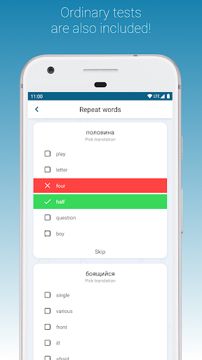- Word tests offer multiple task types that help your brain create associations to better memorize English words, their translations and spelling;