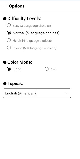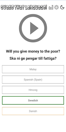 Guess That Language is an educational game that plays an audio clip from any of over 60 languages, and lets you guess the correct language name from multiple choices. All the audio clips are real human voices (no robotic text-to-speech), so you can be sure that you're hearing the real thing.