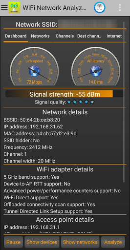 WiFi Monitor is a powerful tool that allows you to analyze the state of WiFi networks and track its parameters (signal strength, frequency, connection speed, etc).