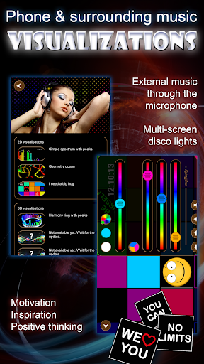 Our visualizations of music are unique. First of all because they can listen to surrounding music (although they also visualize music from your phone). Imagine your own private visualization when you are at a disco or club. Choose your favorite topic and just put the phone on the table.
