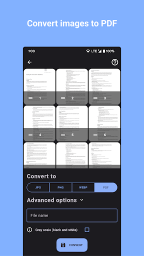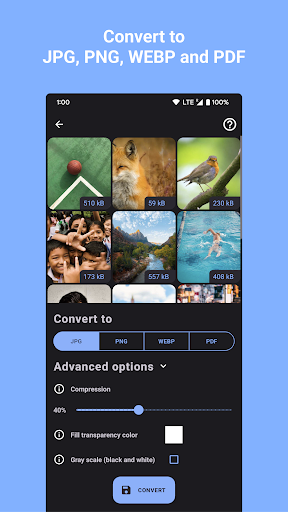 You can convert images to PDF, JPG, JPEG, PNG and WEBP.