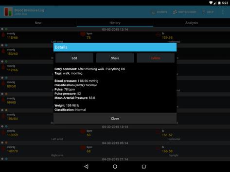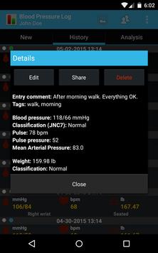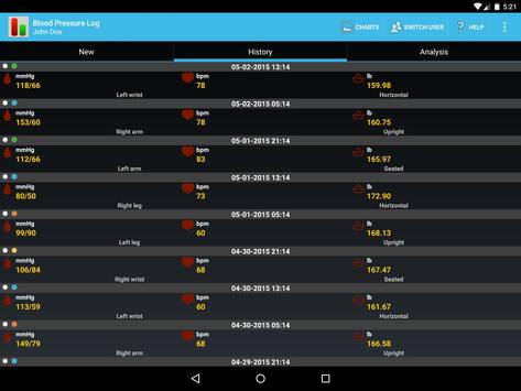 The app allows storing all crucial details, and for as many users as you like too, each having their own dataset. The details you can store include date and time, site and position, systolic and diastolic pressure, heart rate, weight (in kg or lb). Each entry can be stored with an optional comment (all versions), and a set of text tags (version 1.5 or newer).