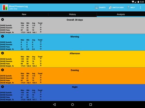The app also provides some essential analysis, presented in a quick overview screen and a set of charts. The overview screen summarises minimum, maximum and mean values over a pre-defined period of time, and time of day, with indication of long-term trend. As an extension to the basic analysis, the app provides multiple charts which can use all data points separately or daily averages (configurable). All data is assessed based either on the North American JNC7 classification, or the European ESC classification, which is configurable.