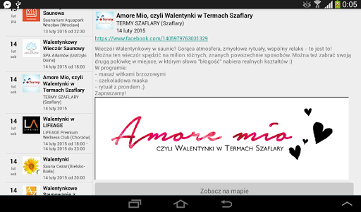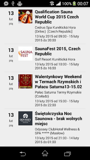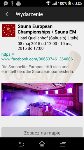 - wyświetlenie nadchodzących wydarzeń saunowych ogłoszonych na Facebooku.