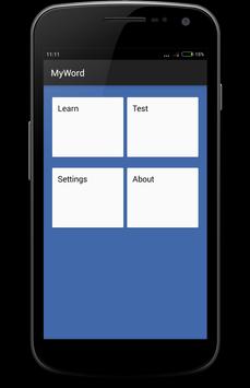 My Word is an app that helps you learn new words in the English language. Words are categorized as beginner, intermediate and advanced and presented as a set of flash cards. Each flash card lists the word, its meaning, part of speech, synonyms, antonyms and usage. Once you learn a set of words, you can test yourself with a multiple choice test on the words that you have learnt.