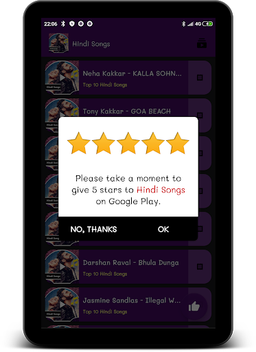 Hindi Songs Lovers, Let us know of what you think about our App in the reviews and what could be improved for your Top 10 Hindi Songs Application and If you like my app, please rate us 5 stars and leave a nice comment, thank you so much Injoy it !