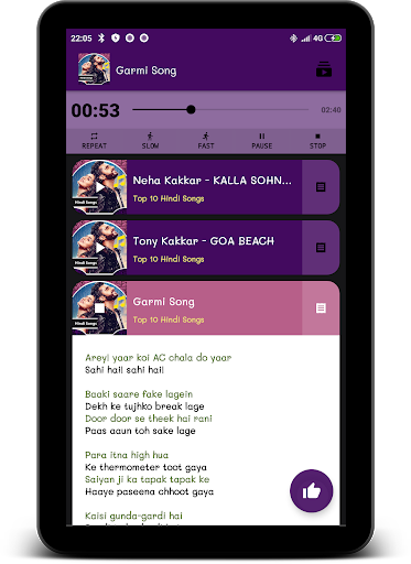 Hindi Song's Application is a Collections of Top 10 Bollywoods Songs and comes with lyrics in each song and this application can run Offline without need for internet.