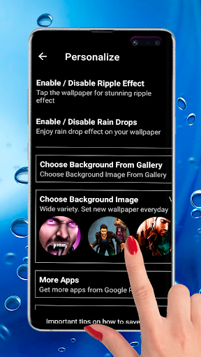 Fresh, new and stylish look is that you need today to be popular and trendy! Our cool Application will make your device nice and unique. Here are a great choice of different themes, which will satisfy any taste as adults, children and teens. Our cute and nice HD wallpapers with water ripple effect will make you happy! In addition, you will like that this FREE APP are very easy in using and customizing and does not waste your memory space and battery charge.