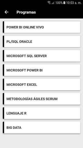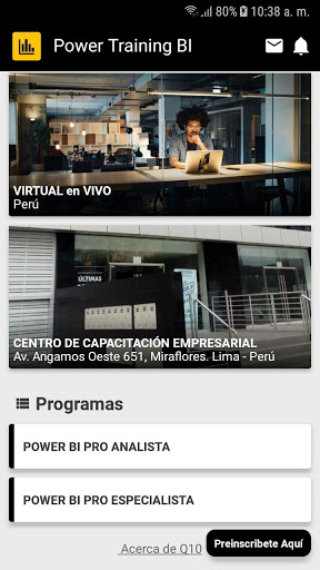 La aplicación móvil de Power Training BI permitirá a los aspirantes visualizar las carreras ofrecidas por la institución, de igual forma los estudiantes podrán visualizar sus notas, su horario de clase, interactuar por medio de las aulas virtuales y recibir notificaciones.