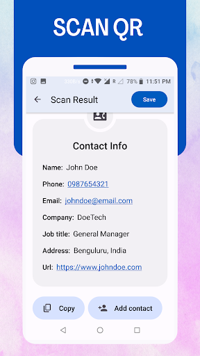 This QR code making app is helpful to create code for contact info, email, WiFi, message, social media accounts or any website links quickly.