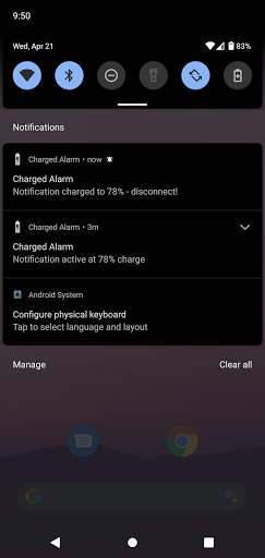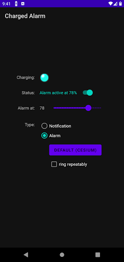 Charged Alarm is a simple application to notify you when your device is charged to the level you specify.