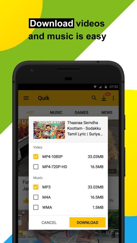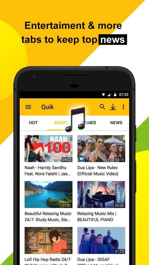 [Music Storage] World's most popular music library: plenty of songs and music videos will satisfy even the pickiest listeners. [Hot Videos] Tons of popular entertainment videos will bring you lots of excitement, joy and fun! [Global News] Keeping you up to date on the breaking local and global news and latest story developments. [Simple Interface] User-friendly interface, beautiful layout - complicated is now simplified. Intelligent search, hot recommendations, entertainment news, clear and distinct classification. Quik Video offers you a lot of short and viral videos that will fill your day with joy and fun! Watch all the hot and trendy stuff, bring more entertainment into your life! With the help of powerful data analysis we acquire your favorite content from the sea of information. We’ve created this mobile reading platform for users to enjoy reading to the fullest. Although we haven’t met, we would like to know more about you. Please share your comments.