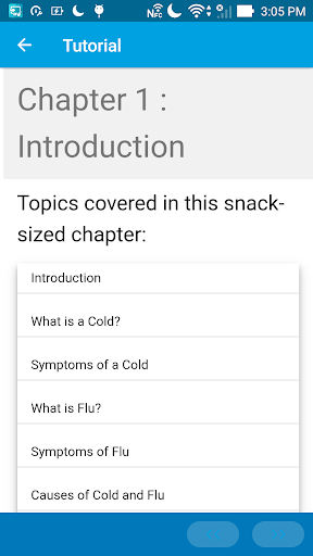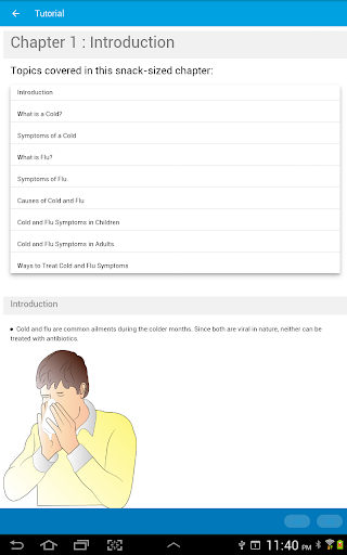 You have limited access to the content provided. For full access to the content, please login and purchase this application. This app provides a quick summary of essential concepts in Cold and Flu by following snack sized chapters: