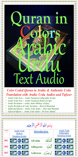 This App presents a Color-Coded Quran in Arabic Text with a corresponding Urdu Text translation. The purpose is to provide an Urdu translation of the Quran juxtaposed to the Arabic text with color coding. It is meant to aid readers whose language is not Arabic but who intend to understand Quran in Arabic.