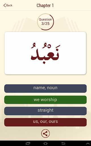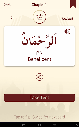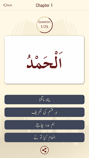Start by the first letter of the quran and learn its english or urdu meaning. Keep on going until you reach the last word in the quran in a memory based flashcard style. While learning, you can take a MCQ (multiple choice test) with four options to see if you have mastered the meaning of the islamic text. Choose the correct option to see the next word. So its kind of like a game. Once you complete a chapter, you can share the results with your facebook friends or via email.