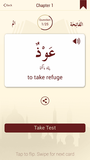 Learn the 6700 unique words of the Holy Quran in an easy to use flashcard style app. The Arabic of each word is displayed on a card that can be tapped to see its English and/or urdu translation. You can then swipe to see the next card and explore different lessons and chapters. Once you have memorized few words, take a multiple-choice test (in English or Urdu) to see how much you have mastered.
