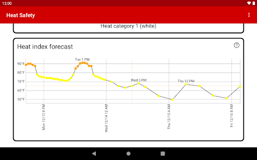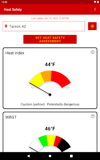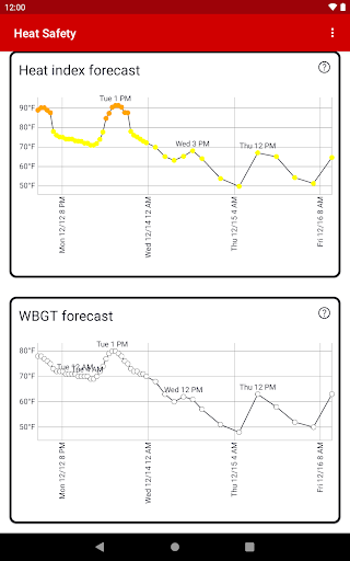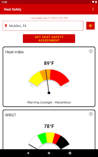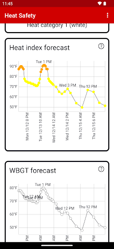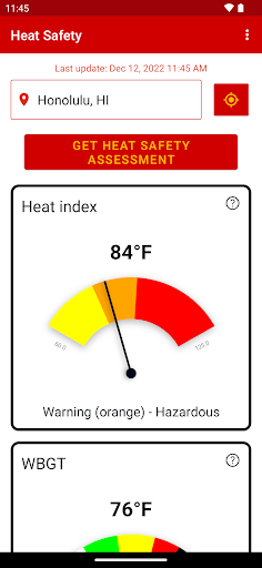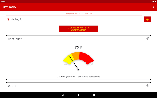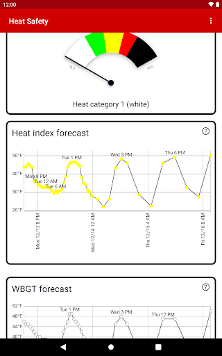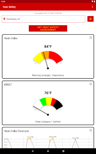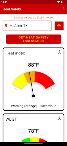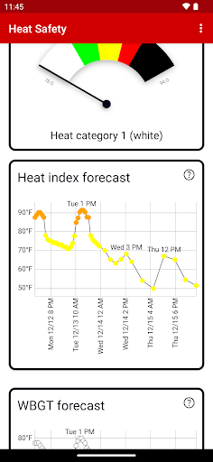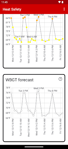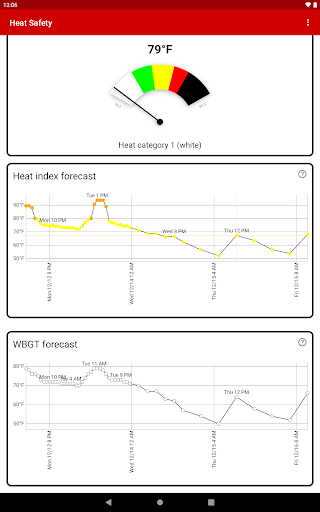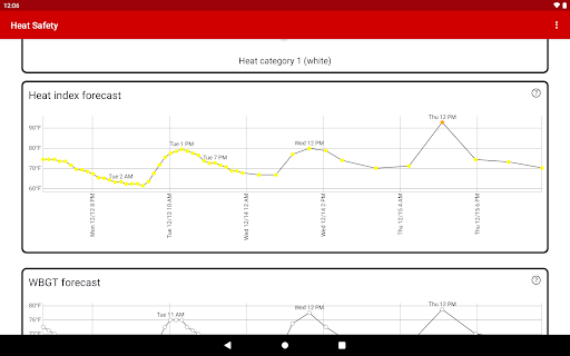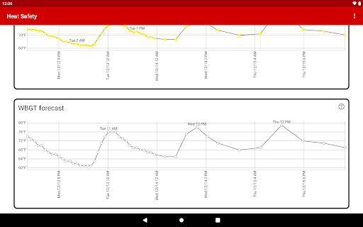 Display various hot weather measurements including psychrometric wet bulb globe temperature, heat index, temperature, and humidity in order to plan outdoor work activities and risk levels for occupational safety and health. Useful for coaches, managers, and workers.