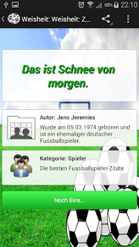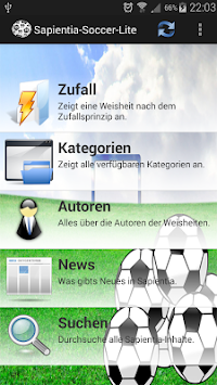 Sapientia-Soccer-Lite - Die liebevoll gestaltete App für Zitate, Sprüche, Witze, Weisheiten und noch viel mehr rund um das Thema Sport. Ein Spruch, ein Zitat, ein Witz oder eine Weisheit, Sapientia-Soccer-Lite bietet dir die Möglichkeit schnell auf Inhalte verschiedener Kategorien wie Sport oder Fussball-Zitate etc. zuzugreifen. Rund um das Thema Fußball. Auch der Zugriff auf berühmte Zitate bestimmter Autoren und Manager ist ohne Probleme möglich. Alle Inhalte werden ständig aktualisiert und erweitert. Jeden Tag entstehen neue Kategorien und neue Autoren werden hinzugefügt.