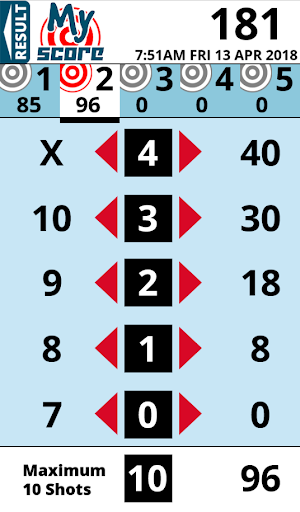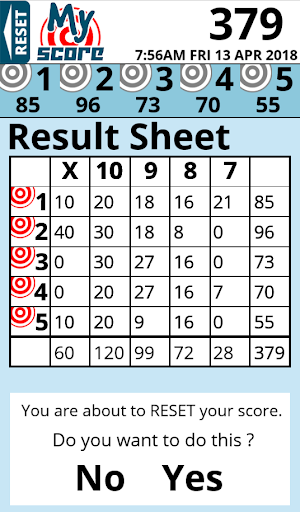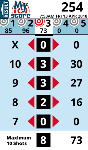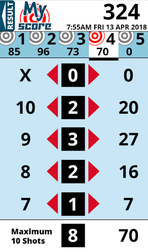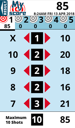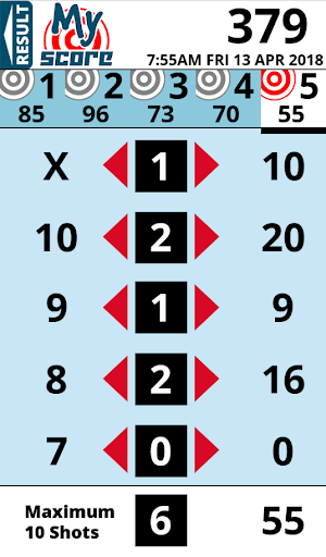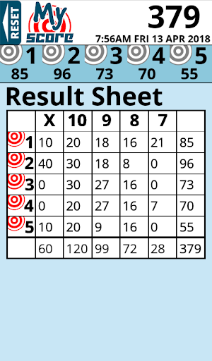 This is a simple to use app that takes the stress out of adding up your score after a competition in your favourite target sport. This version is for adding up scores over five targets with ten attempts at each target. It was originally designed for the B27 style target, so the score range is from seven to ten (including Bulls).