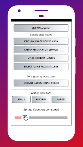 This App have radha krishna 3d live view where a cube with six faces is rotating continuously. User can change the cube size from small to medium, small to large or medium to large.