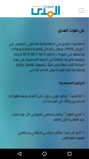 إذاعة صوت المدى هي إذاعة لبنانية فئة أولى، تأسّست في 1 حزيران 2009، ويطال بثّها كل الأقضية اللبنانية ويمكنك متابعتها على الموجات التالية: 92.5-92.7-92.9