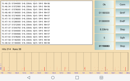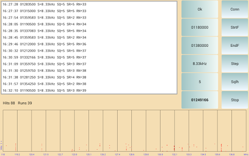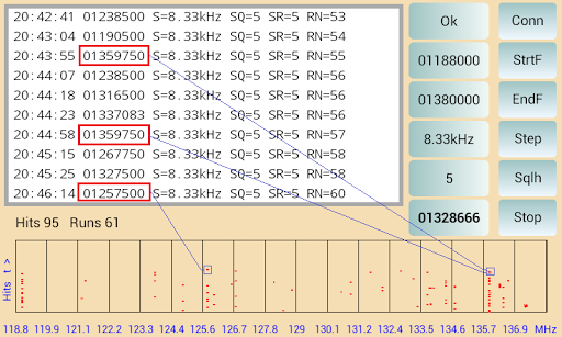 has a special search function. On this search screen the found frequency and signal strength of a transmission is displayed for a given start-end frequency during a time frame.