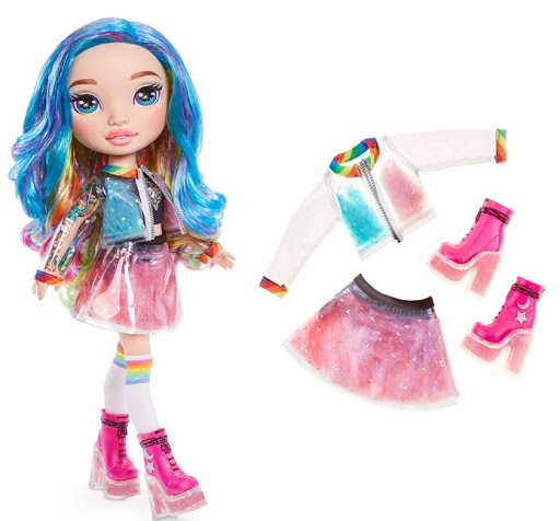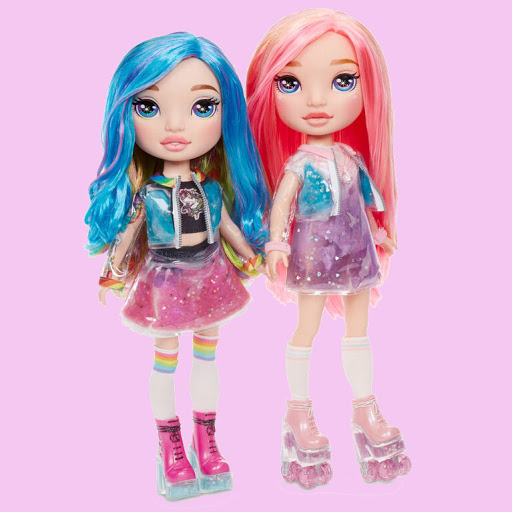 Rainbow Surprise Dolls is the sparkly unicorn with over 20 glittery surprises that magically poops glitter slime! She's gotten a stunning, sparkly makeover with glitter from head to toe. Unroll either Stardust Sparkle or Blingy Beauty, each with gorgeous, brushable glitter hair and a cute outfit. Feed her Unicorn Food, sit her on her potty, and she creates surprise, collectible sparkly unicorn poop (slime)! Transform the slime with Unicorn Magic, Unicorn Shimmer, and Unicorn Sparkle and store it in the glittery keychain! Includes one Poopsie Glitter Unicorn, parody bottle, spoon, sparkly collectible keychain, t-shirt, diaper, potty, 4 Unicorn Food slime packets, 2 Unicorn Magic packets, 4 Shimmer packets, 1 Unicorn Sparkle packet, 1 hairbrush, and 1 measuring cup. Collect each Poopsie Glitter Unicorn!