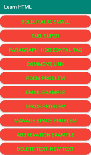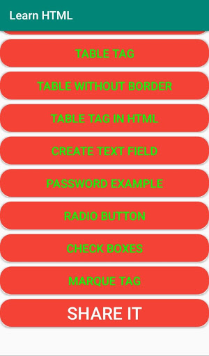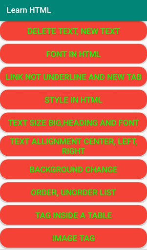 it is best free Learn HTML app.In this learn HTML app you can learn basic to advance tags of HTML. It is best app in play store to learn HTML offline. In this HTML app 35 example of HTML tags with output. Most important tags used in website development. so what are u waiting for try to download my learn HTML and improve your knowledge. If u face any issue in Learn HTML app u can contact me i will try to solve asap. IF you like my html tutorial/html learn/ learn HTML app please gave me 5 star rating.