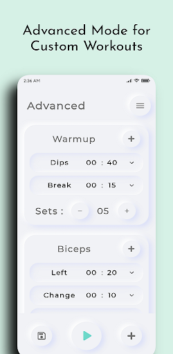 ※ Workouts are highly Customisable with Advanced Mode with multiple groups & exercises each with custom Name, Sets, Type & Time.