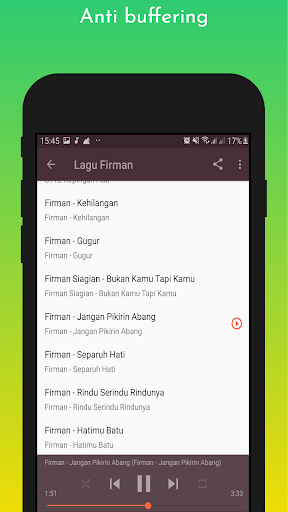 Aplikasi ini berisikan banyak lagu Firman offline lengkap enak didengar. Selain itu juga aplikasi ini sangat ringan sehingga tidak menguras kuota internet Anda, lagu ini bisa Anda dengarkan kapanpun dan di mana saja.
