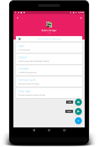 This app manager allows you to create backup of apk and share them.You Can Hide Ur Apps too.And You Can Uninstall App .Clear cache and data in just one click.
