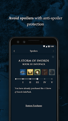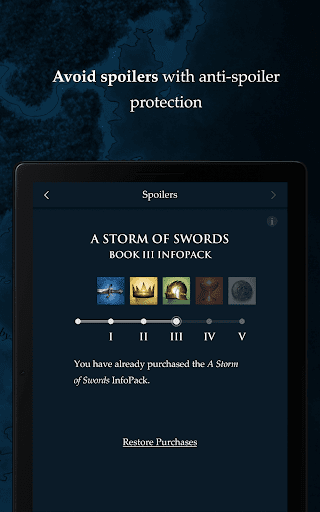 Test drive the app for free and get 8 POV characters from A Game of Thrones and an interactive map of Westeros as well as all the content from A KNIGHT OF THE SEVEN KINGDOMS. Buy one InfoPack for each book – or buy all 5 at once and save a dollar. Get all-new information for free every time an InfoPack is updated.