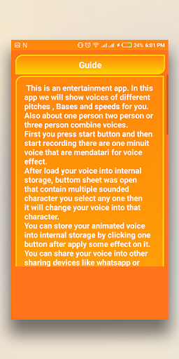 This is an entertainment app.That will provide you amazing voice changing effect. In this app we will show voice of different pitches , Bases and speeds.