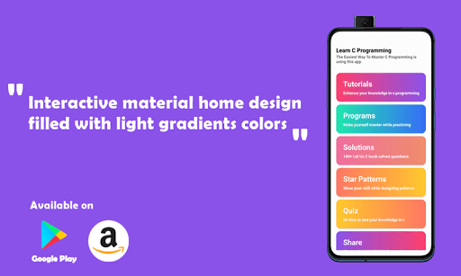 This Learn C Programming app has a really simple and intuitive user interface filled with light gradients colors. The app is really attractive due to its material and colorful design.